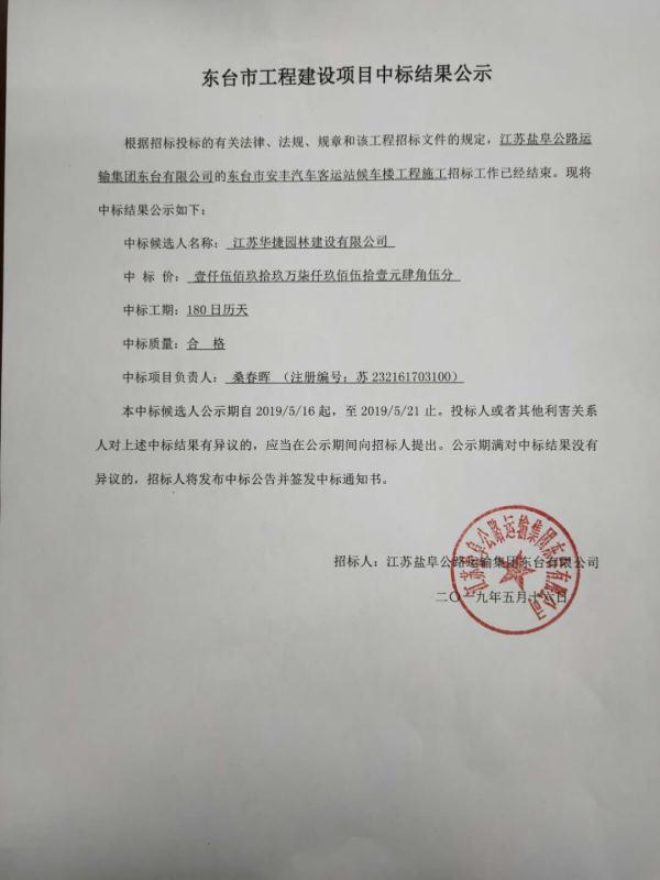 根据招标投标的有关法律、法规、规章和该工程招标文件的规定,江苏盐阜公路运输集团东台有限公司的东台市安丰汽车客运站候车楼工程施工招标工作已经结束。现将中标结果公示如下: