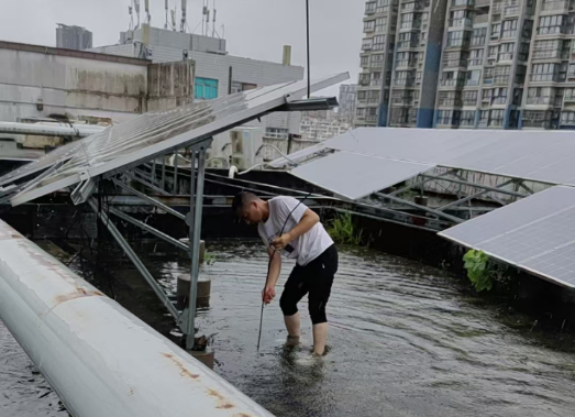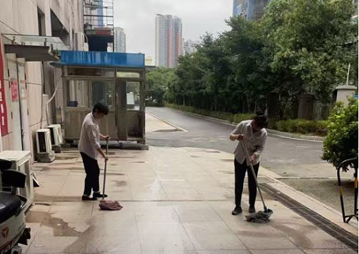 暴雨清晨,新纪元商业广场员工紧急排水保障运营