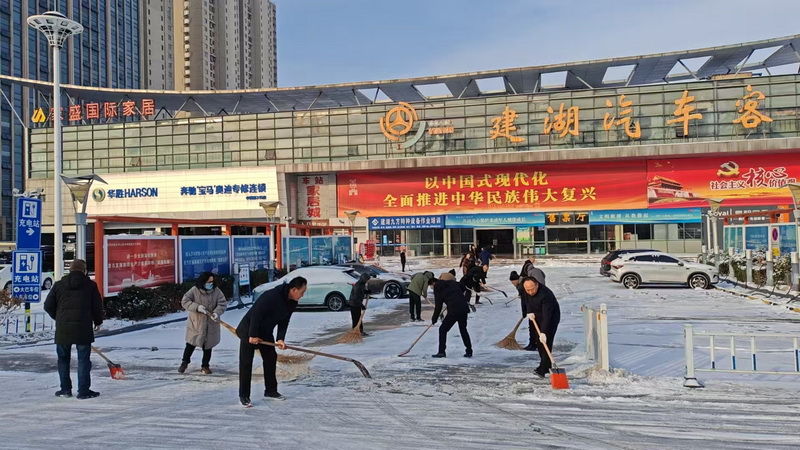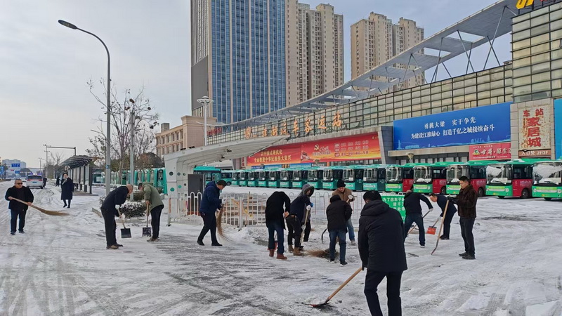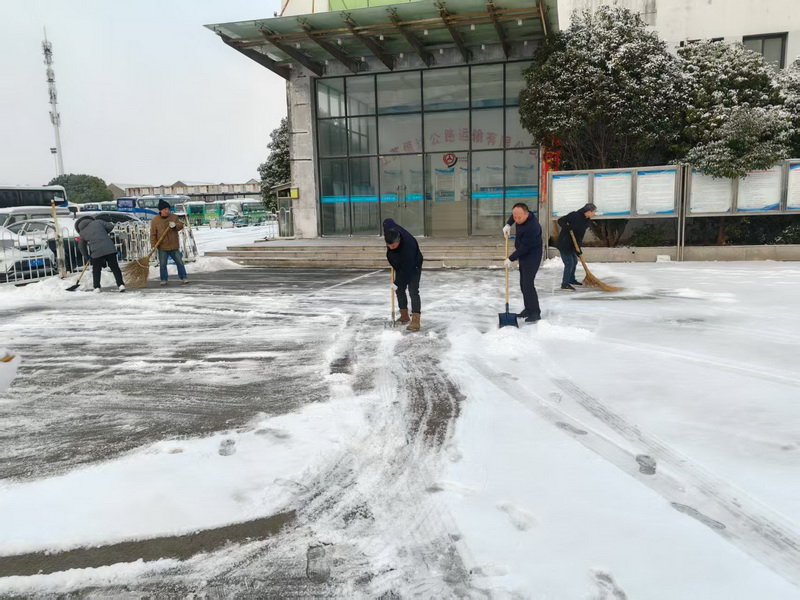 在发车站台,安全管理人员对发班驾驶员安全告诫,车辆停止发班,交待恶劣天气安全行车注意事项。公司主要负责人在站前广场亲自拿起铁锹、扫帚与恒达、恒兴员工一起冒着严寒,清扫站前广场、进站口、出站口、充电桩周边、办公区域、安检台等近1700平方米的积雪。经过近2小时的清扫,车站广场、进站口、出站口等关键部位的积雪和结冰全部清除干净,旅客和车辆可以安全进出车站了。